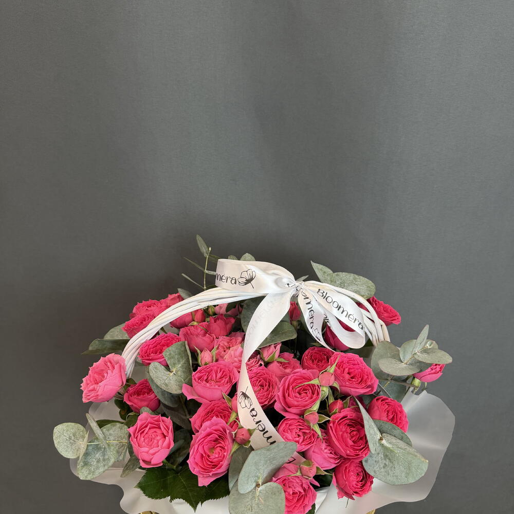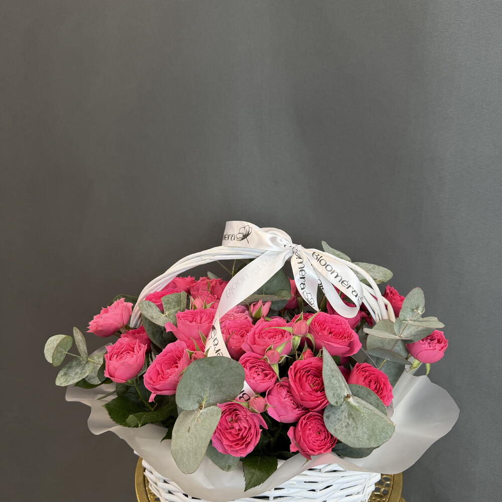 Эвкалипт - 5 шт. Кустовая роза - 7 шт. Корзина плетеная - 1 шт.