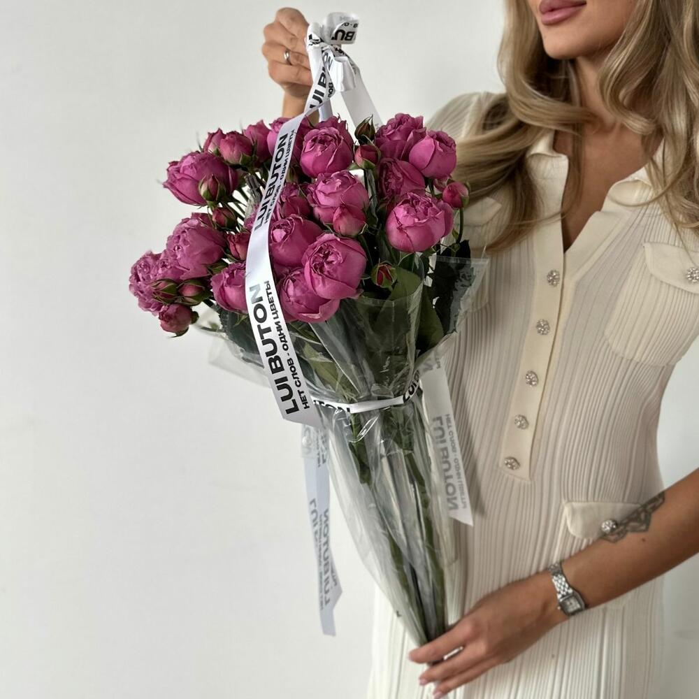 Элегантная композиция в зонтике — стильная альтернатива классическому букету. В состав входят 7 веток кустовых пионовидных роз. Дарит атмосферу праздника и неповторимый шарм