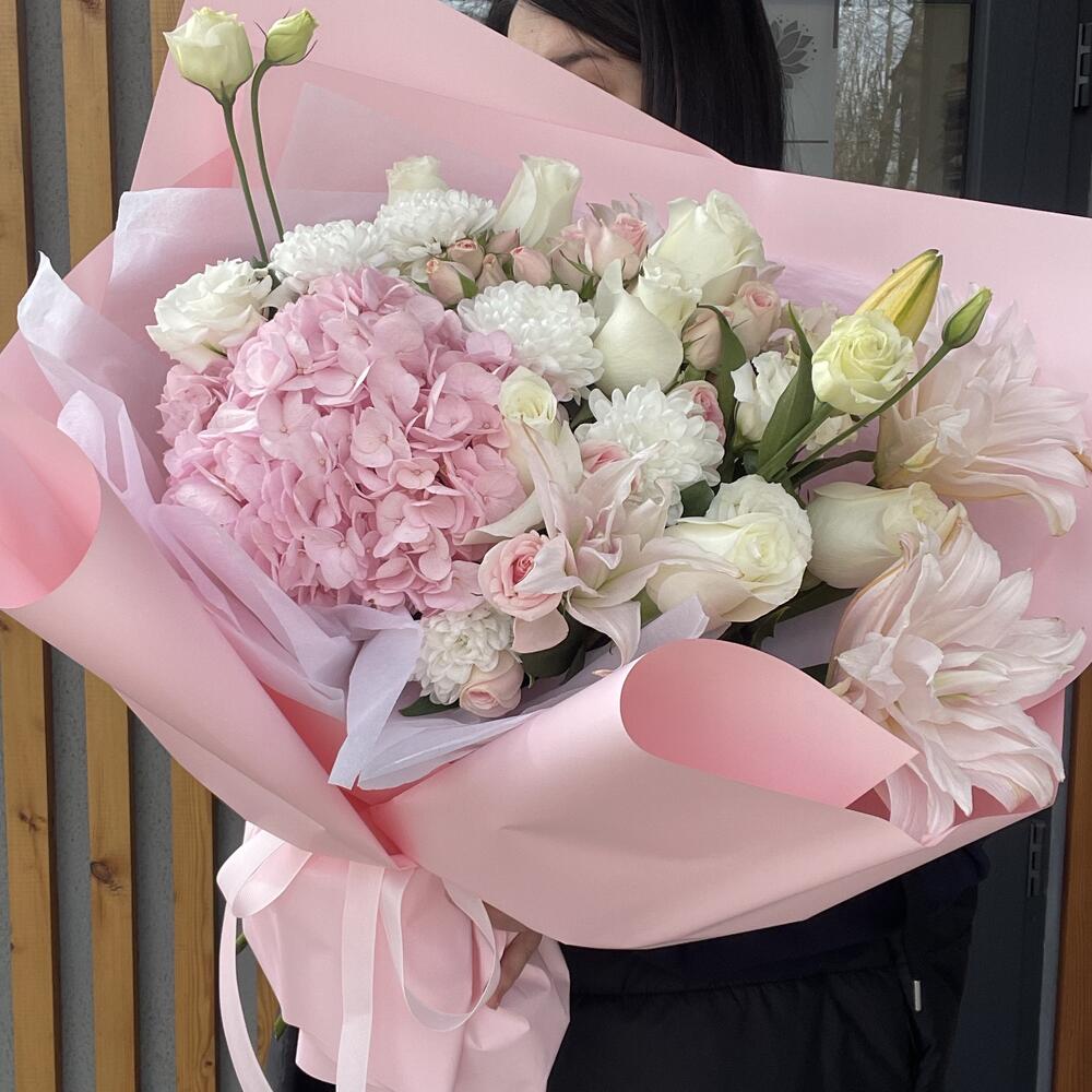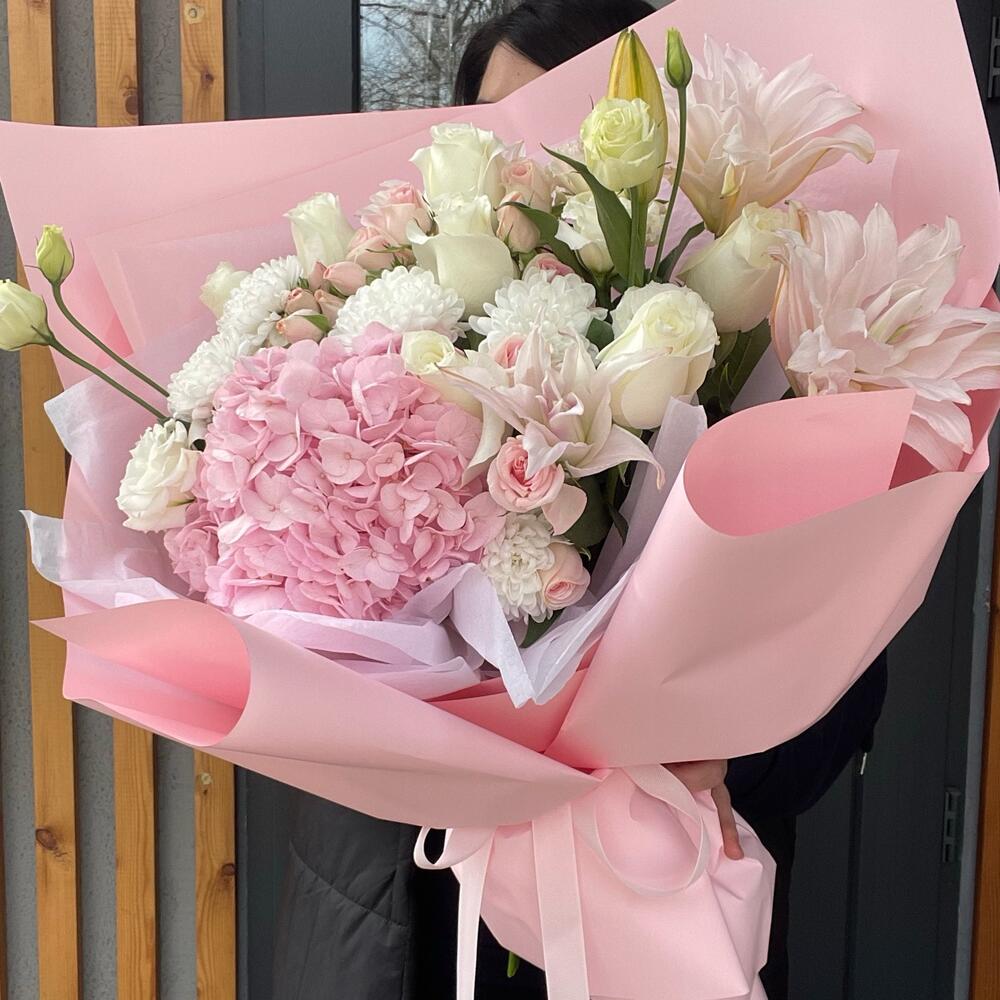 Этот авторский букет будет радовать глаза и сердце своим сочетанием цветов и ароматов. Пышная гортензия объединяется с нежной лилией, окруженной яркими хризантемами. Семь роскошных роз разных оттенков, дополненные четырьмя ветками кустовых роз, создают пышность и объем букета. И, конечно же, утонченные эустома привносят нотку изысканности и элегантности. Этот цветочный шедевр станет прекрасным подарком для любого торжественного события.