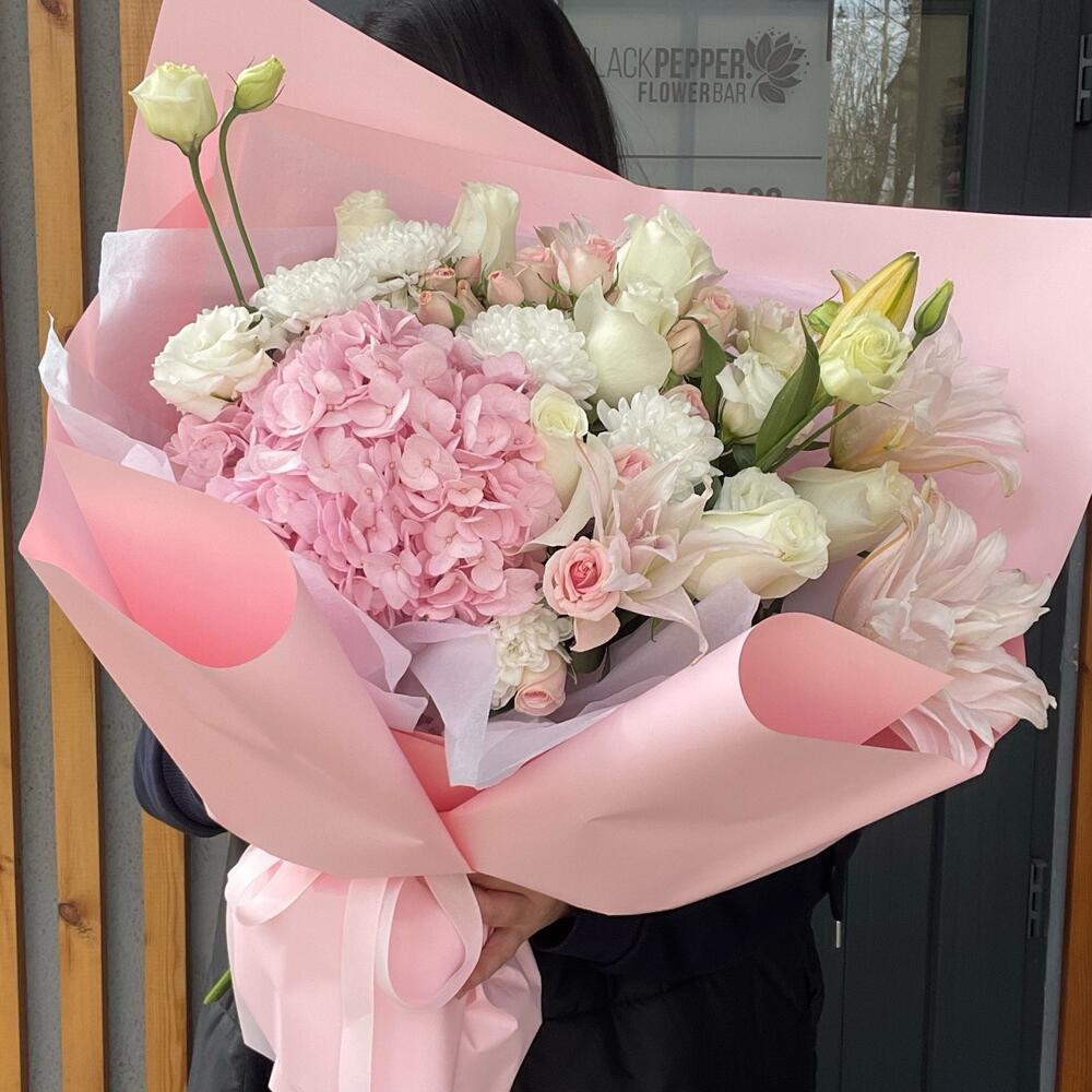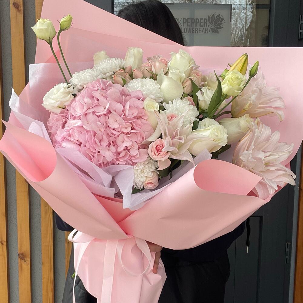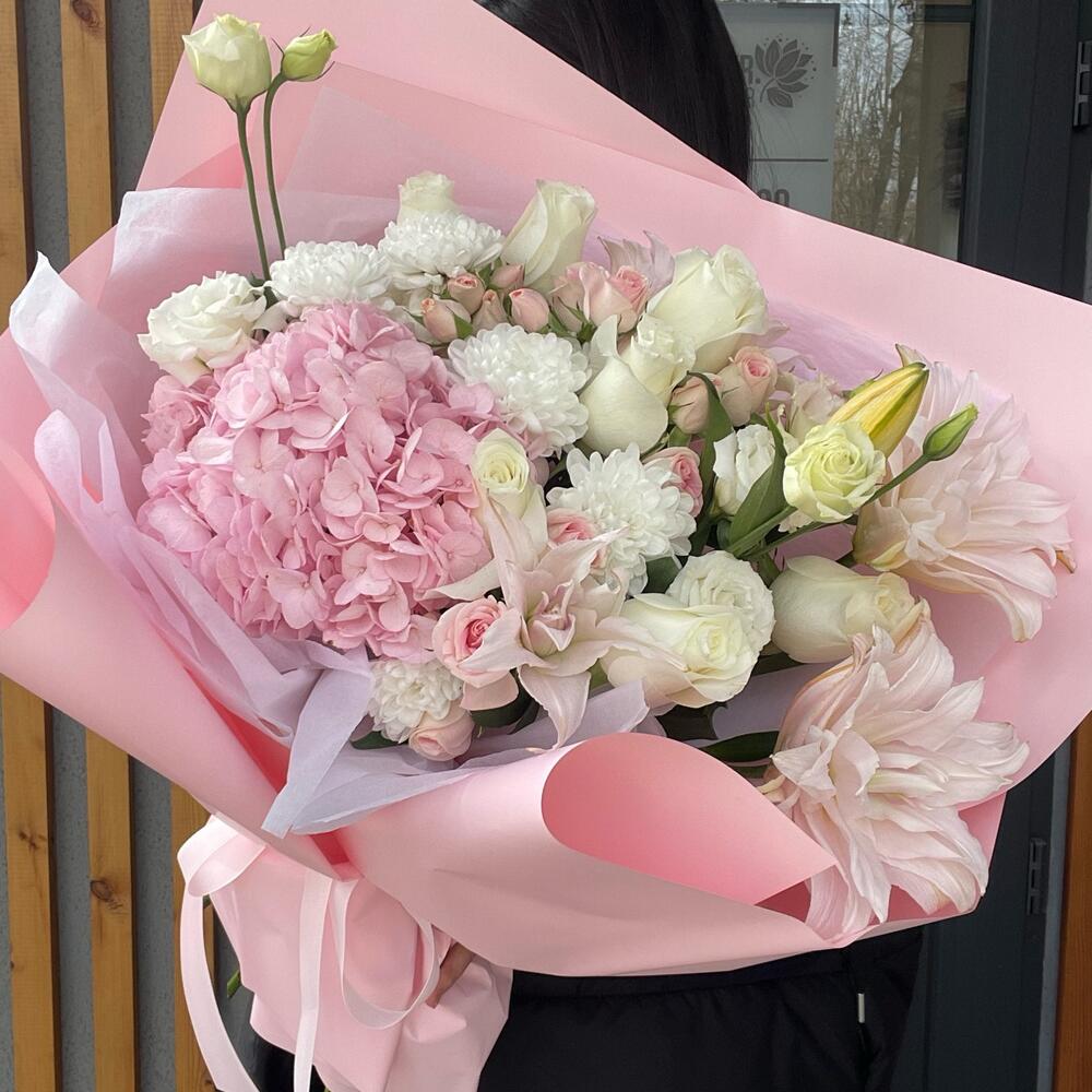 Гортензия - 1 шт. Лилия - 1 шт. Хризантема кустовая - 2 шт. Роза - 7 шт. Кустовая роза - 4 шт. Эустома - 2 шт.