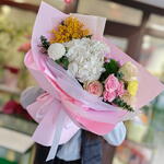 Гортензия - 1 шт. Мимоза - 1 шт. Роза кустовая - 1 шт. Хризантема кустовая - 1 шт. Гвоздика - 1 шт. Роза 50 см - 3 шт. Хризантема одноголовая - 2 шт. Гвоздика зеленая - 1 шт. оформление дизайнерское - 1 шт.