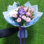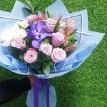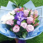 Букет "лавандовое облако " с экзотической орхидеей ванда, кенийскими розами, альстромерией и хризантемой.