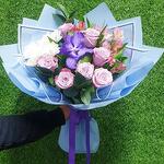 Альстромерия - 3 шт. Рускус - 2 шт. Хризантема кустовая - 1 шт. Упаковка дизайнерская - 4 шт. Ванда орхидея - 1 шт. Аспидистра лист - 1 шт. Роза сиреневая кенийская - 7 шт.