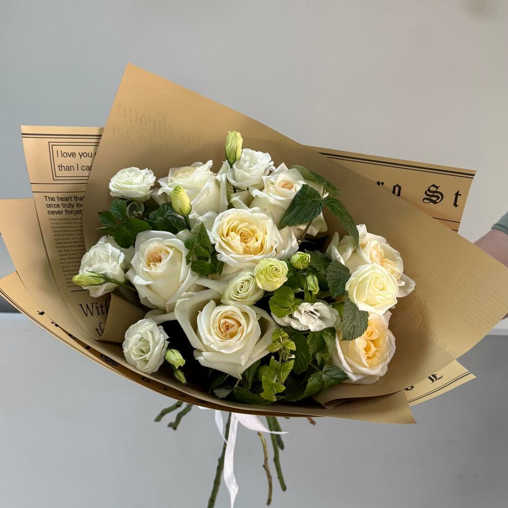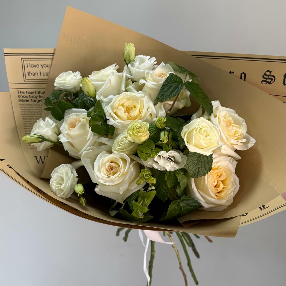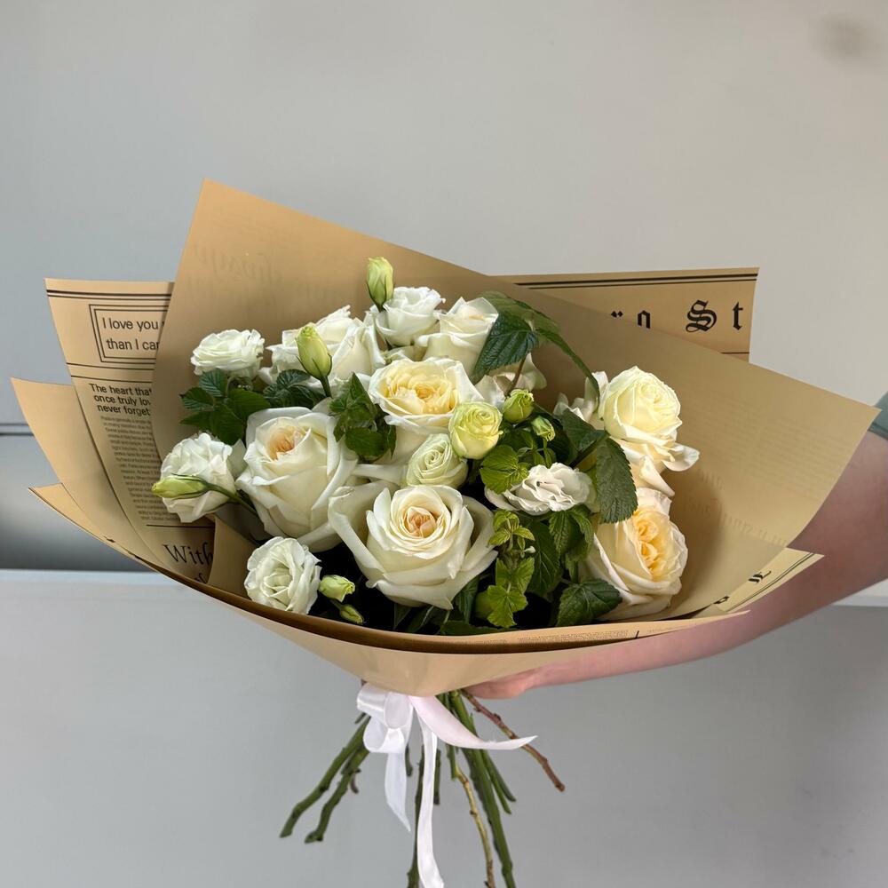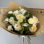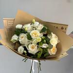 Лента атласная - 1 шт. Упаковка дизайнерская - 3 шт. эустома белая - 6 шт. розы эквадор - 7 шт.