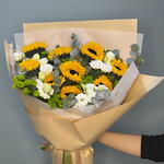 Удивительный авторский букет станет олицетворением теплоты и уюта. В его составе 5 изящных цветов лизиантуса, добавляющих нотки нежности. 9 солнечных подсолнухов наполняют композицию позитивной энергией и радостью. Хризантема пуговка зеленого цвета в количестве 5 штук придает свежесть и естественность букету. Завершающим акцентом служит ветка эвкалипта цинереи, подчеркивающая уникальность и изысканность композиции. Этот букет станет оригинальным и красивым подарком на любой праздник.