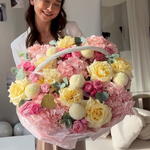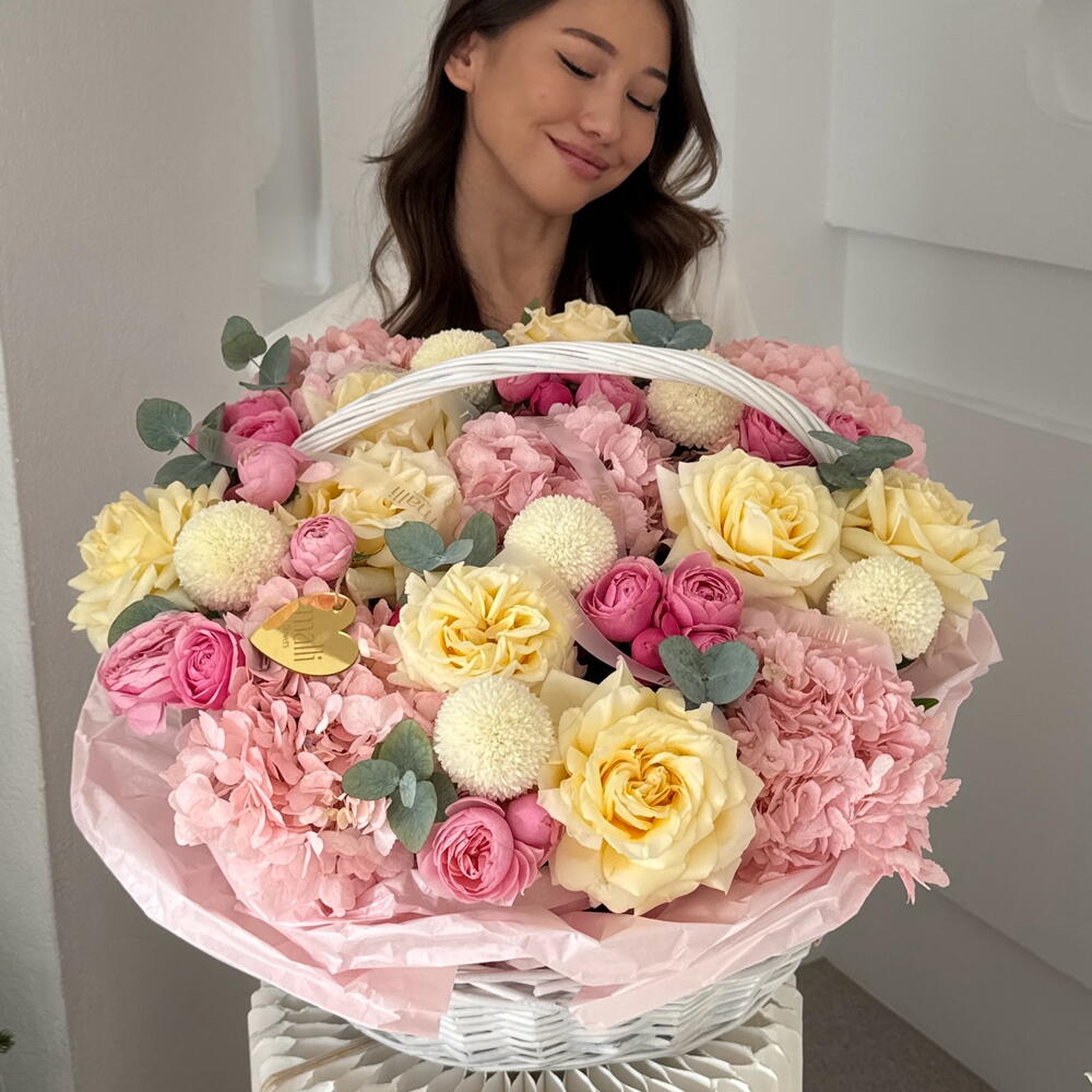 Гортензия - 5 шт. Кустовая роза - 6 шт. Пионовидная роза - 8 шт. Эвкалипт Цинерея - 8 шт. момоко - 6 шт.