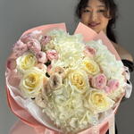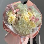 Гортензия белая - 3 шт. сборный букет - 13 шт. спрей пионовидная роза - 5 шт. аква бумага - 5 шт. розы канделайт - 5 шт.