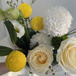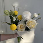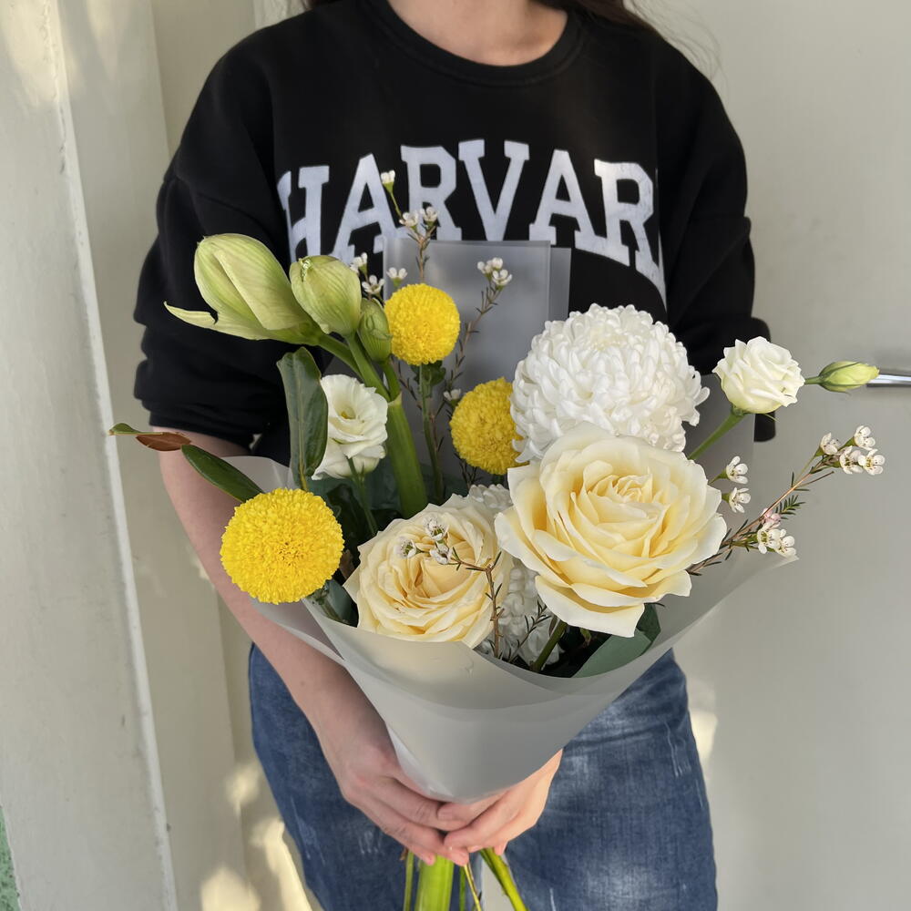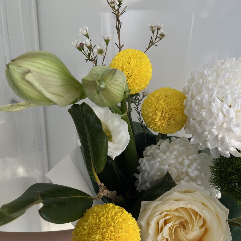 Эустома - 1 шт. Аквабокс - 1 шт. Хамелациум Белый - 1 шт. Хризантема помпон - 3 шт. коробка транспортировочная - 1 шт. хризантема бигуди - 2 шт. роза кэндллайт - 2 шт. барбатус киви меллоу - 1 шт.