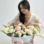 эустома белая - 17 шт. Эустома нежно-розовая - 7 шт. зелень декоративная - 6 шт.