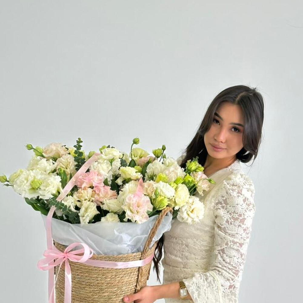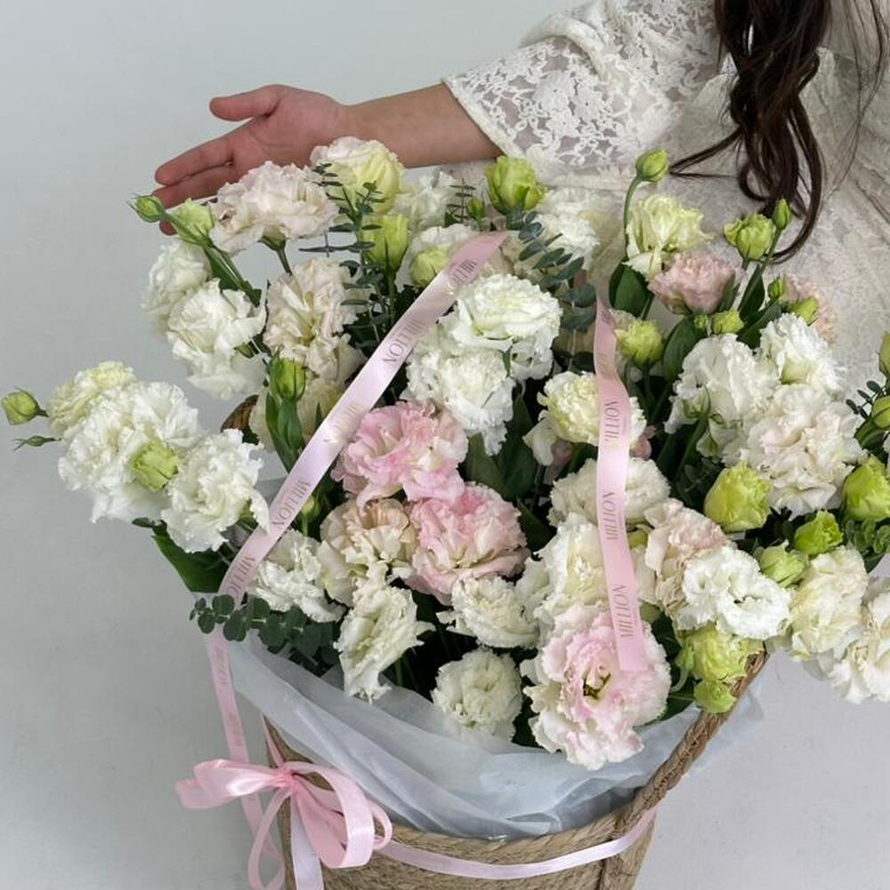 эустома белая - 17 шт. Эустома нежно-розовая - 7 шт. зелень декоративная - 6 шт.
