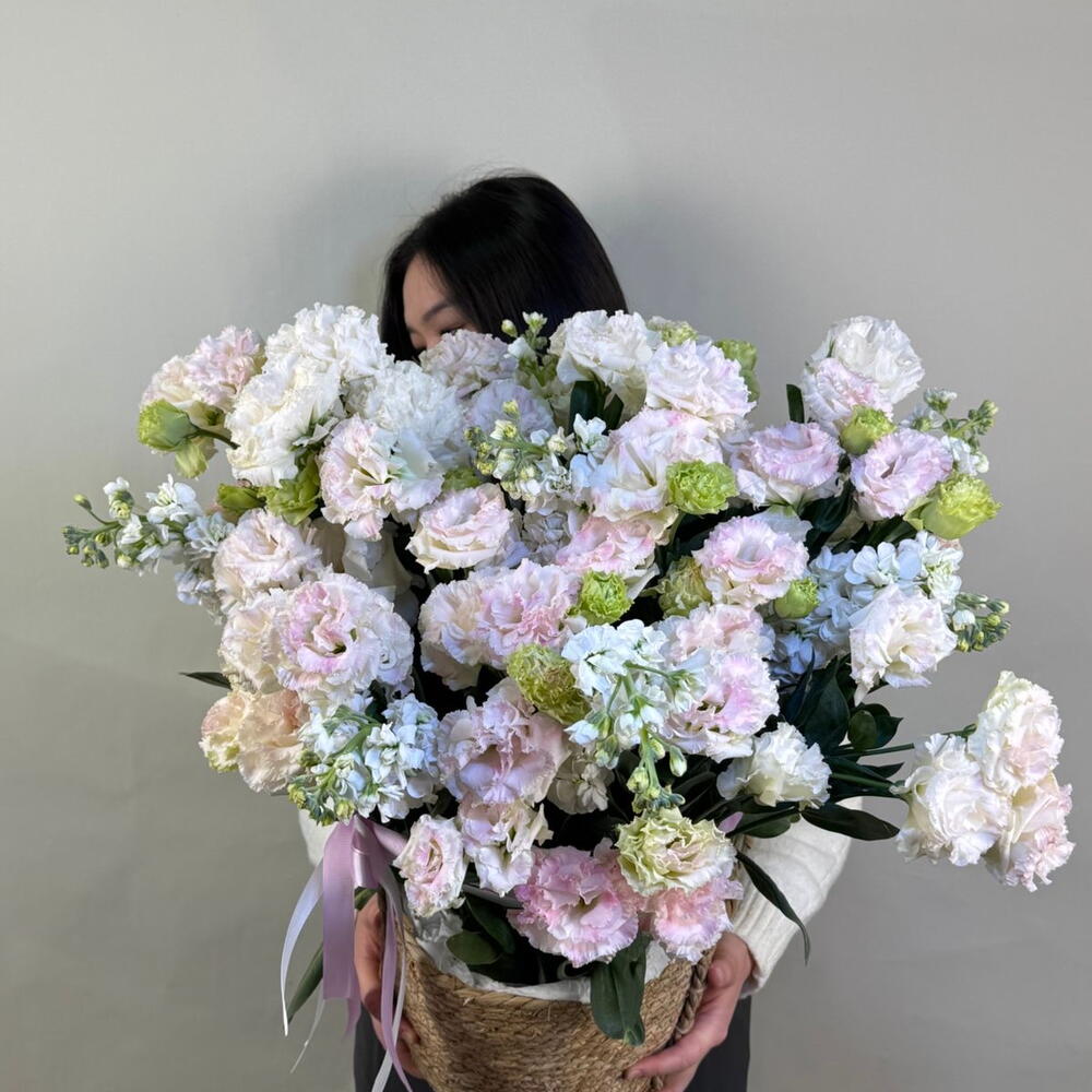 Маттиола - 4 шт. Эустома - 30 шт. Кашпо - 1 шт.