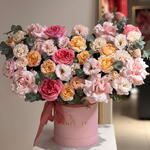 Эустома - 7 шт. Эвкалипт пучок - 1 шт. пинк мондиаль - 5 шт. джульетта кустовая роза пионовидная - 3 шт. пинк экспрешн - 4 шт. коробка брендированная м - 1 шт.