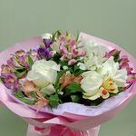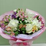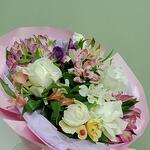 Этот изысканный букет сочетает в себе элегантность белых роз и яркость цветных альстромерий. Нежные, словно облака, розы символизируют чистоту и искренность чувств, а игривые альстромерии добавляют композиции энергии и тепла. Такой букет станет идеальным подарком для особого случая, подчеркнёт утончённый вкус и передаст самые тёплые пожелания.