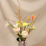 Антуриум - 1 шт. Ирис - 2 шт. Тюльпан - 2 шт. Гвоздика - 3 шт. Форзиция - 1 шт. Голландская роза - 2 шт. Ранункулус - 1 шт.