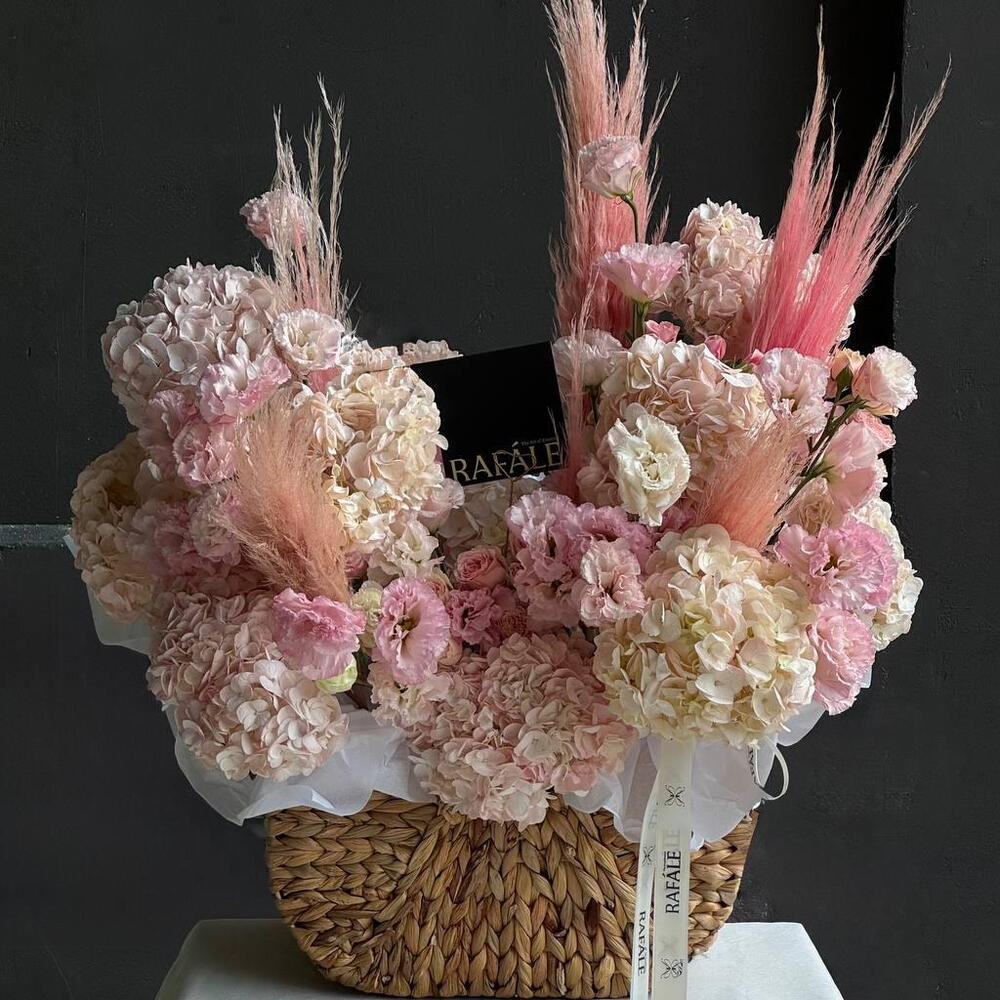 LUX 13.0 — это искусство в цветах. Воздушная, многослойная композиция с эффектом «галерейного объекта», которая выглядит как инсталляция, а ощущается как признание в любви. Пышные гортензии задают объём и мягкость, нежный лизиантус добавляет утончённости, розы — глубины чувств, а пампас создаёт ту самую вау-фактуру, из-за которой хочется рассматривать композицию снова и снова. Плетёное кашпо-лодочка завершает образ — дорого, нестандартно, очень эстетично.
