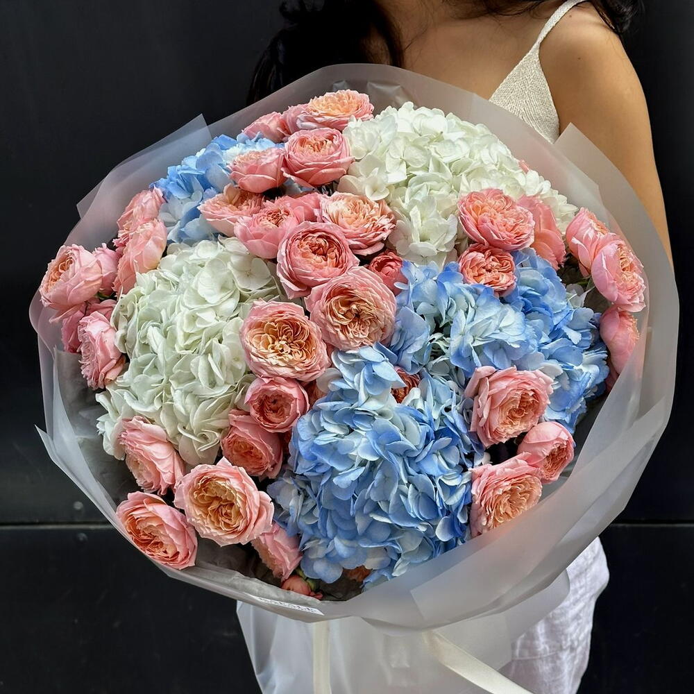 LUX 192.0 — это про гармонию, вкус и спокойную роскошь. Воздушные гортензии в молочных и небесно-голубых оттенках создают ощущение лёгкости и объёма, а пионовидные спрей-розы добавляют тепла и романтики. Букет выглядит мягко, дорого и очень фотогенично — тот самый вариант, который хочется долго рассматривать.