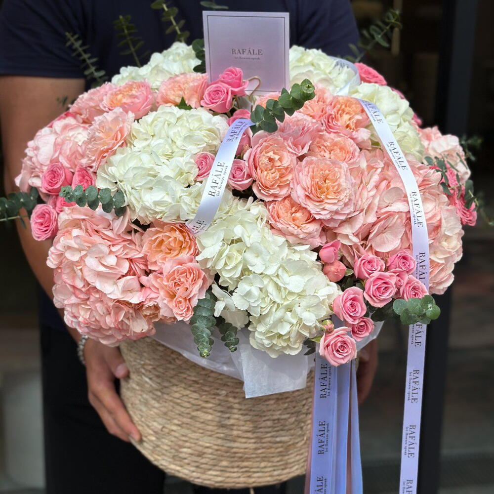 LUX 6.0 — это подарок без компромиссов. Масштабная, пышная композиция в кашпо, которая говорит о чувствах громче любых слов. Объёмные гортензии создают эффект роскоши, спрей-розы и пионовидные розы в нежных розово-персиковых оттенках добавляют романтику и глубину, а эвкалипт подчёркивает свежесть и благородство композиции.