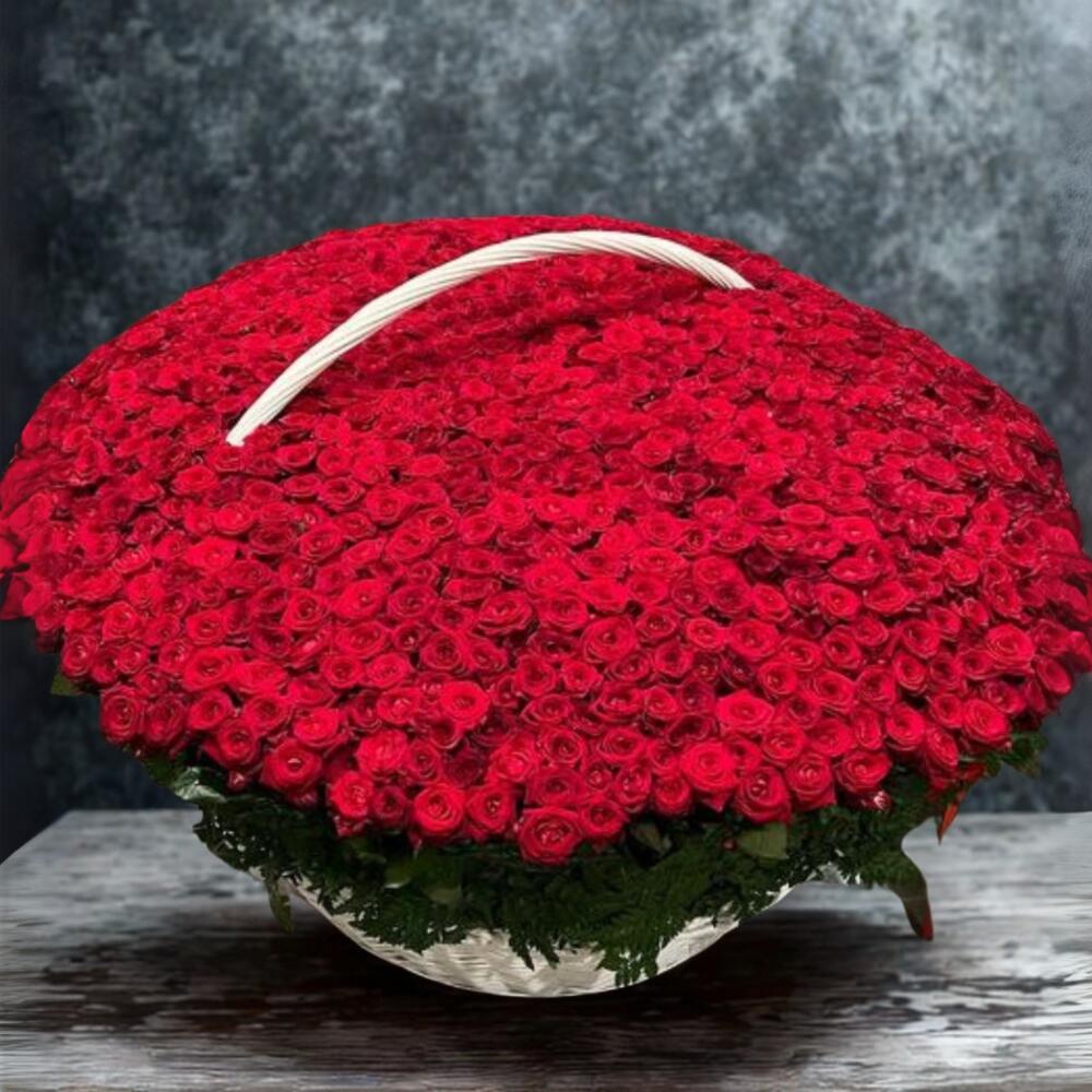 Роскошная корзина из 303 голландских роз (50 см) — величественный и трогательный жест. Белая плетёная корзина подчеркивает нежность, чистоту и масштаб любви. Подарок, о котором мечтают.