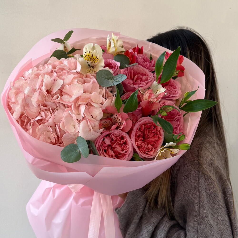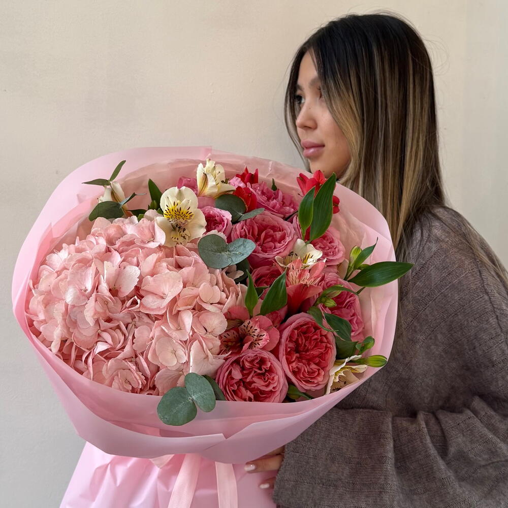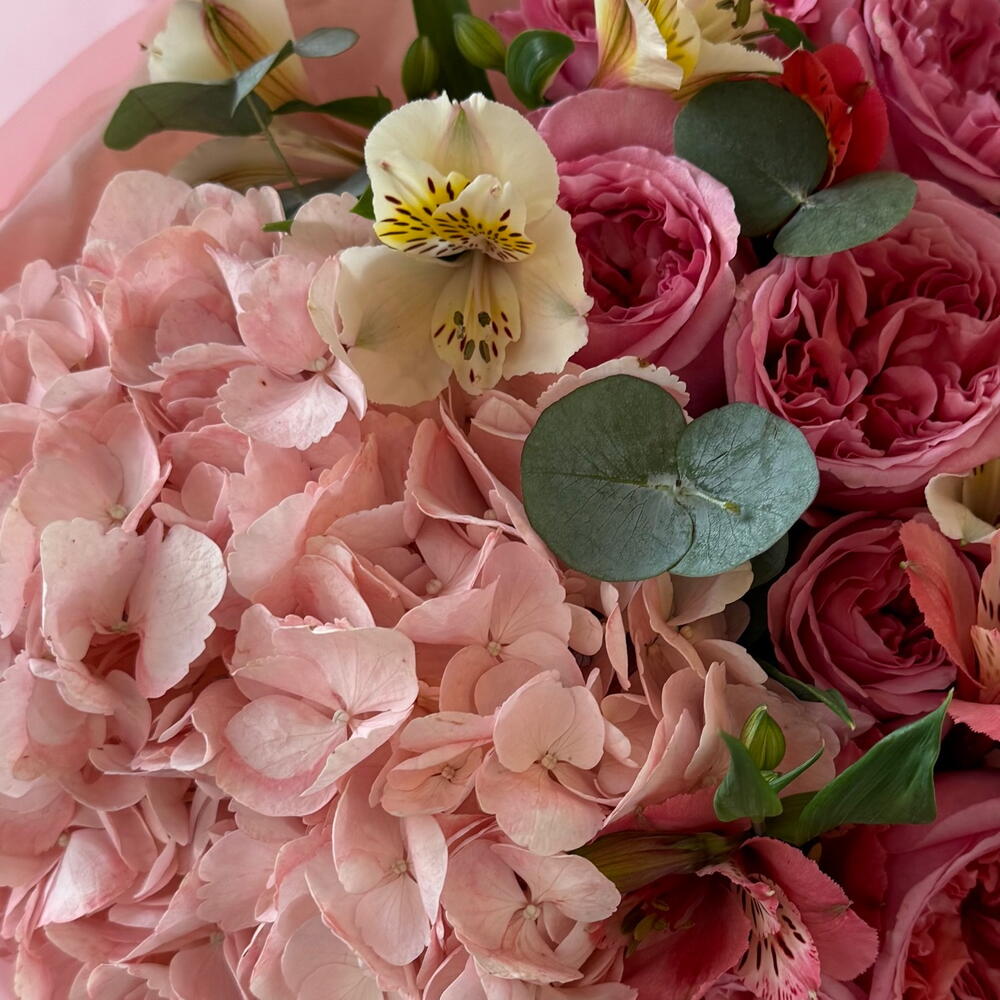 В составе букета: гортензия, пионовидные розы сорта pink expression, альстромерия и эвкалипт. Такое сочетание цветов считается классикой во флористике, нежные и одновременно яркие цветы, с ароматным эвкалиптом порадуют любимого человека и запомнятся надолго.
