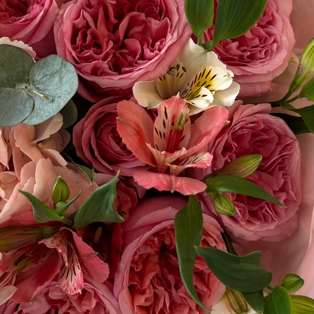 Альстромерия - 3 шт. Эвкалипт Цинерея - 4 шт. Роза пионовидная эквадор - 9 шт. оформление дизайнерское - 1 шт. Гортензия Премиум Микс - 1 шт.