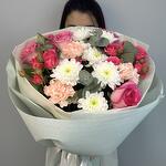 Хризантема кустовая - 2 шт. Роза - 5 шт. Кустовая роза - 2 шт. Гвоздика - 3 шт. Эвкалипт Синерия - 2 шт.