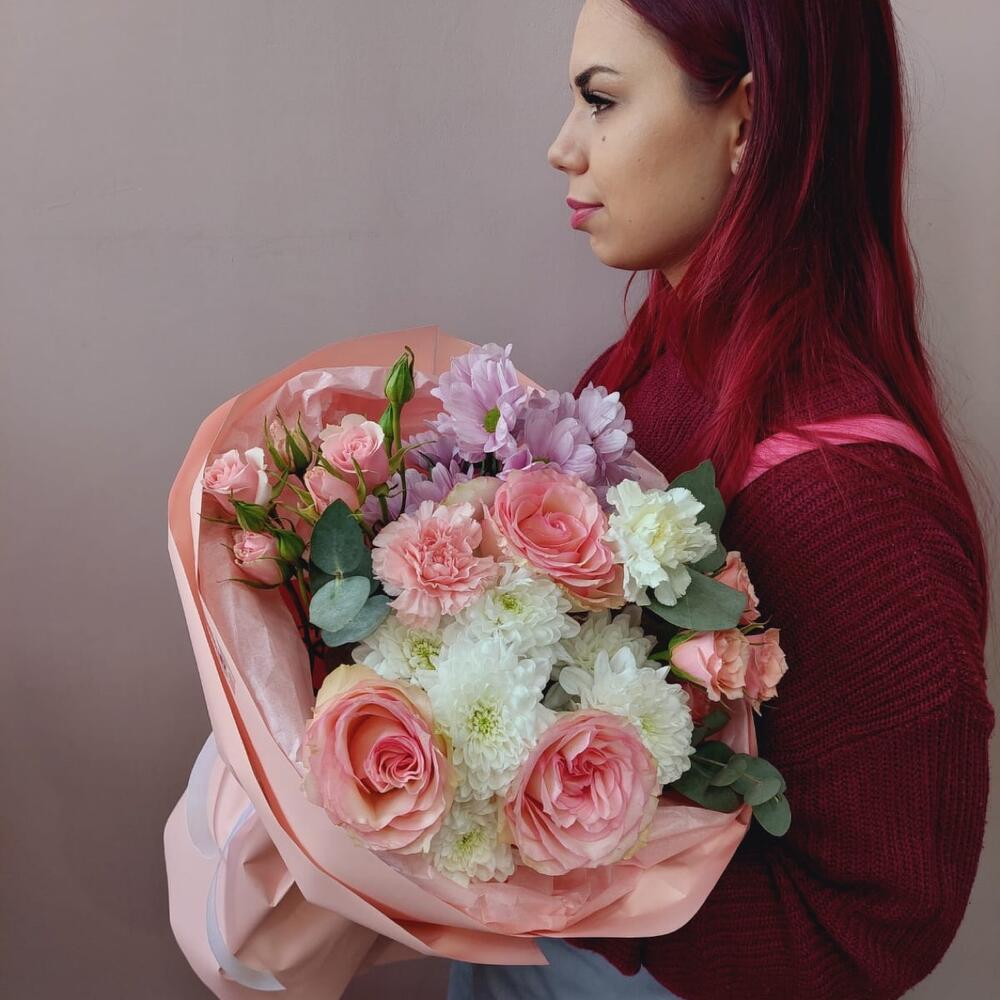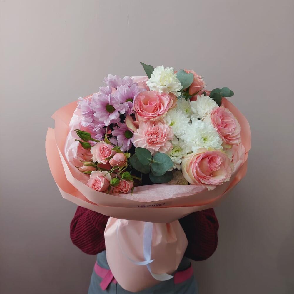 Роза кустовая - 2 шт. Эвкалипт - 1 шт. Роза - 3 шт. Диантус - 5 шт. хризантемы кустовые - 2 шт.