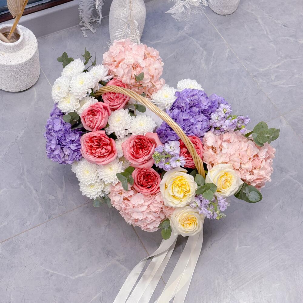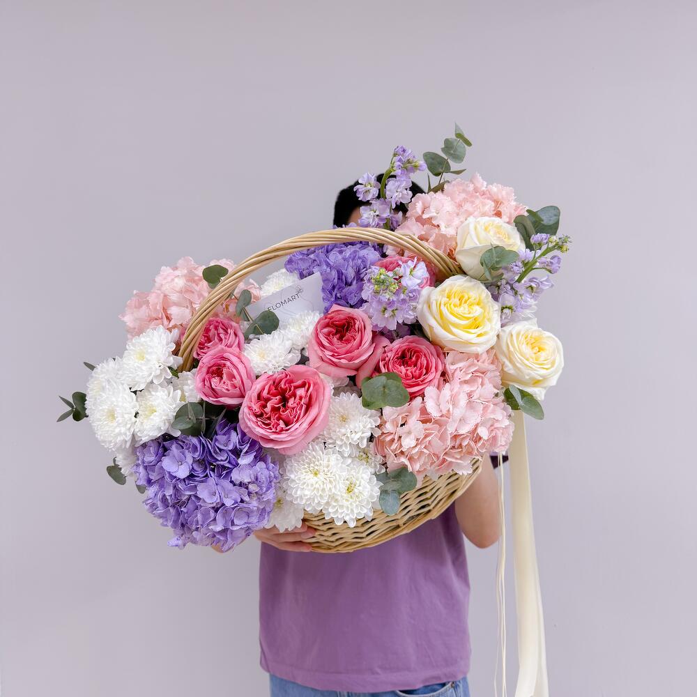 Корзина - 1 шт. Маттиола - 3 шт. Эвкалипт - 1 шт. Роза - 9 шт. Хризантема - 4 шт. гортензии - 5 шт.