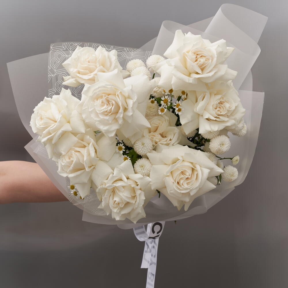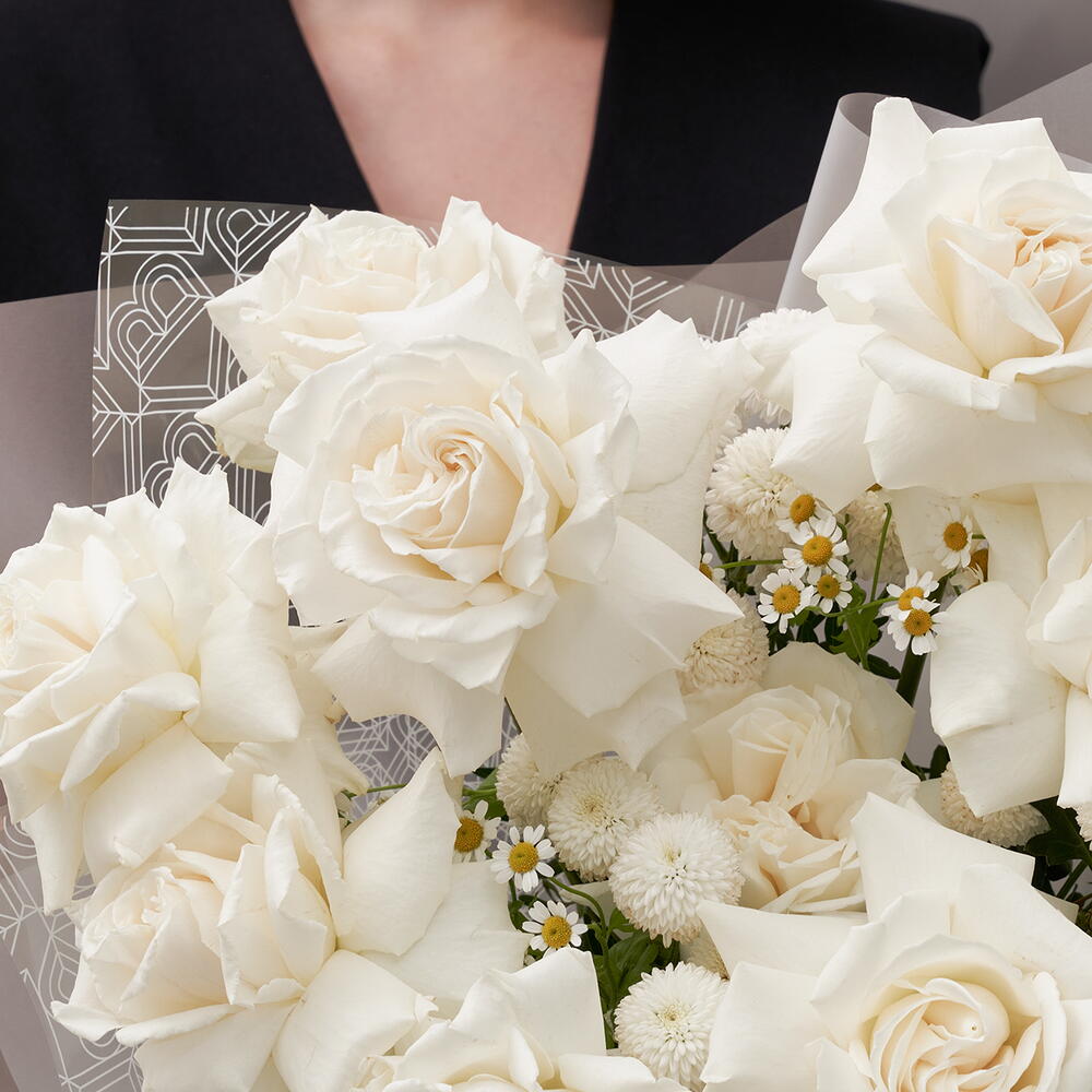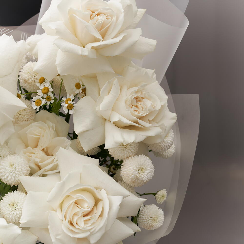 Хризантема кустовая - 3 шт. Ромашка - 2 шт. Роза Эквадор - 9 шт.