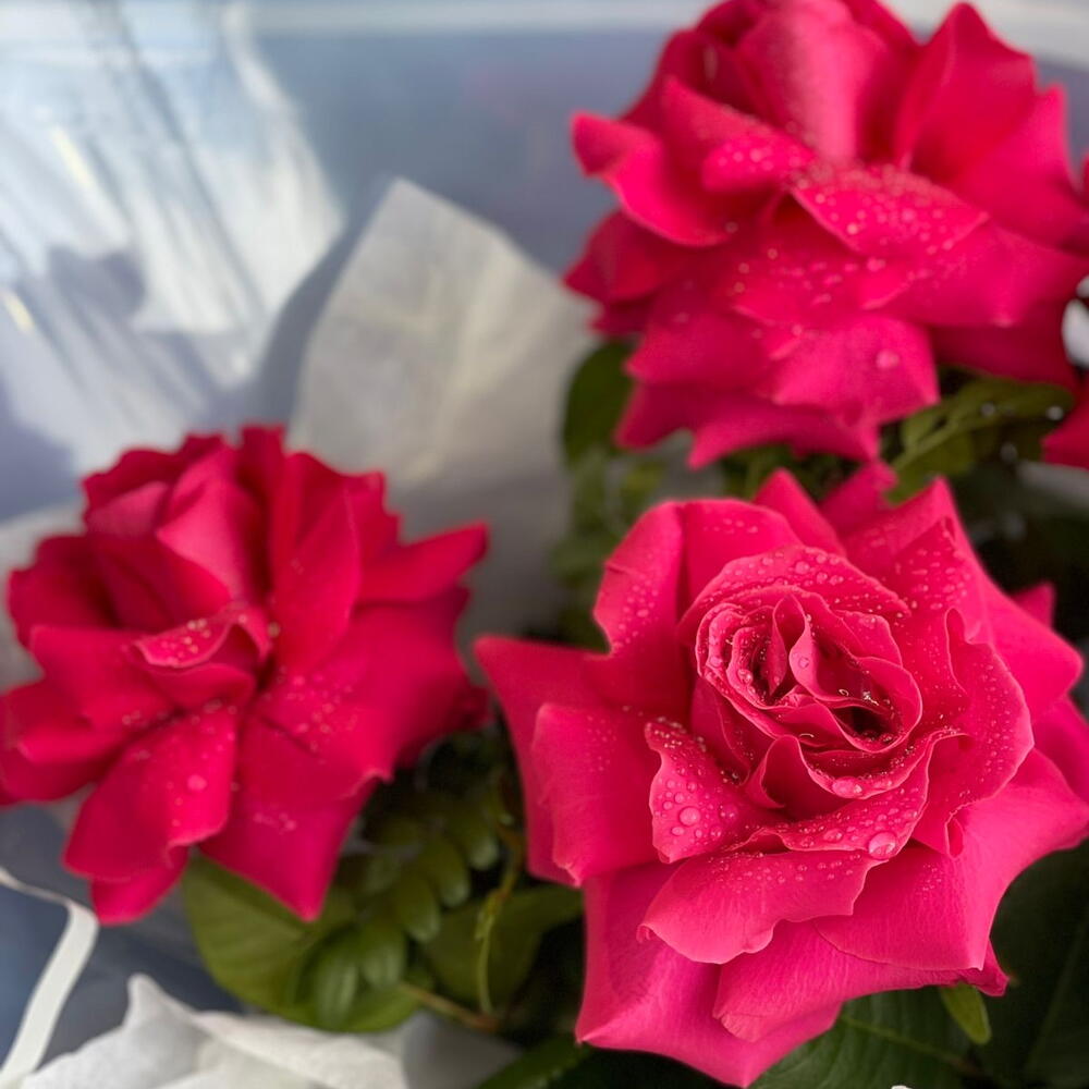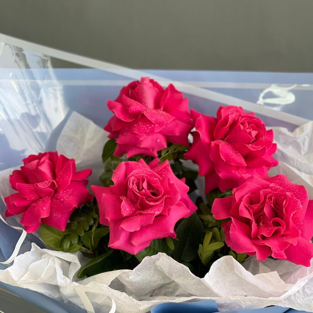 Пять роз — это букет для тех, кто ценит лаконичность и символизм. В отличие от огромных охапок, такая композиция смотрится очень дорого и камерно. Алый цвет здесь играет главную роль — он притягивает взгляд и создает настроение праздника.