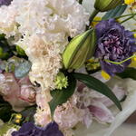 Хризантема Сантини - 2 шт. Роза Эквадор - 5 шт. Диантус - 5 шт. Молюцелла - 2 шт. оформление дизайнерское - 1 шт. маттиола кустовая сиреневая - 3 шт. лилия королевская - 2 шт. онцидиум - 2 шт.