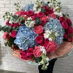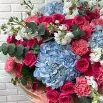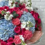 Эвкалипт - 4 шт. Лента атласная - 2 шт. Тишью - 4 шт. Гортензия голубая - 3 шт. Маттиола Белая - 10 шт. Фоамиран - 3 шт. Спрей роза - 8 шт. диантус (гвоздика) розовый - 10 шт.