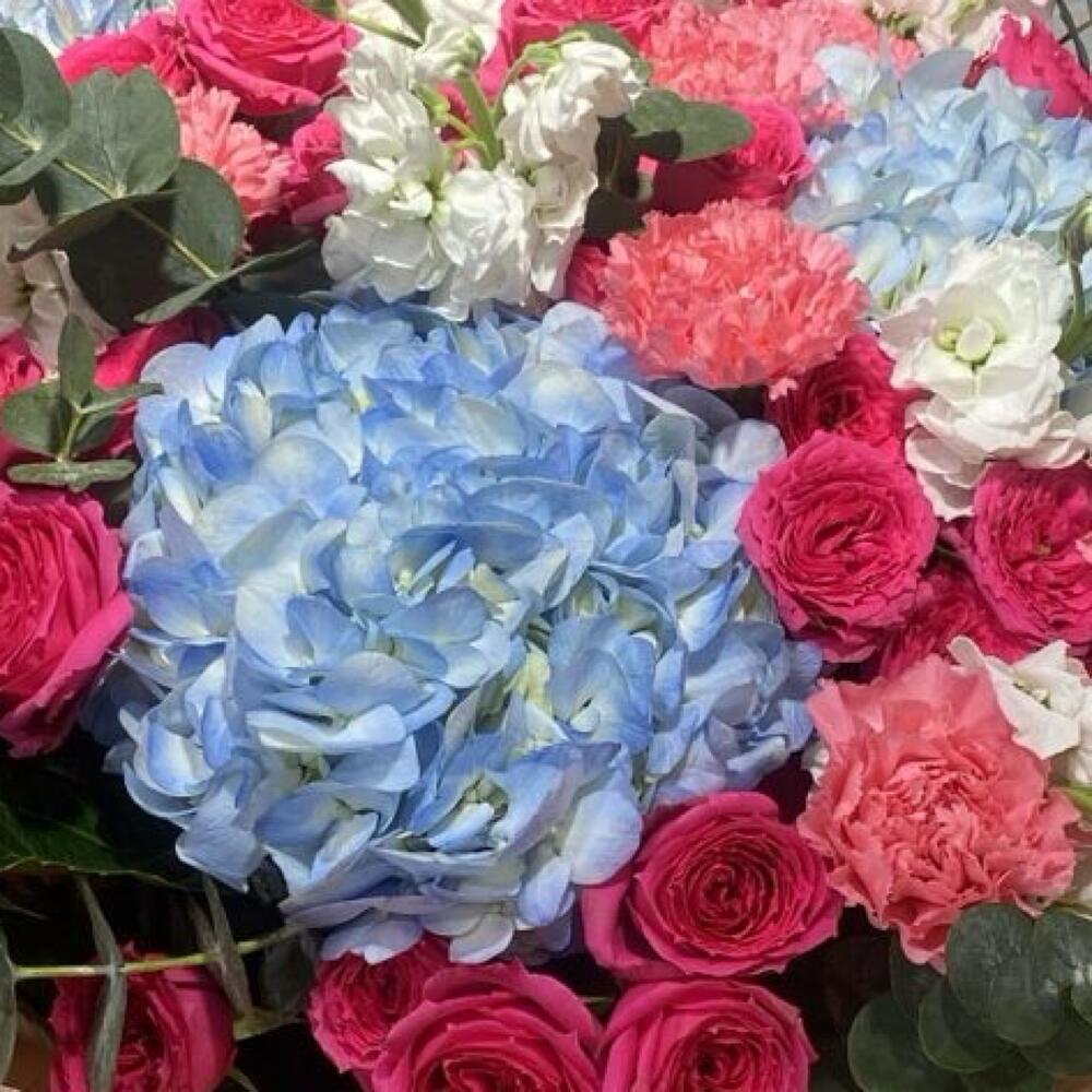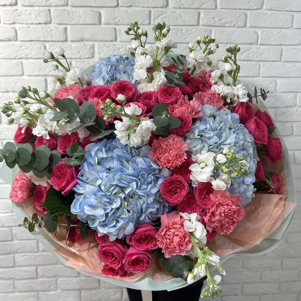 Эвкалипт - 4 шт. Лента атласная - 2 шт. Тишью - 4 шт. Гортензия голубая - 3 шт. Маттиола Белая - 10 шт. Фоамиран - 3 шт. Спрей роза - 8 шт. диантус (гвоздика) розовый - 10 шт.