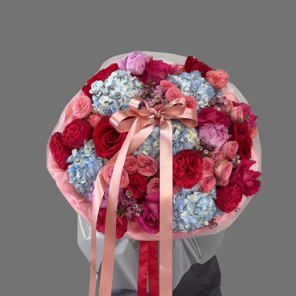 Ваксфлауэр - 3 шт. Гортензия - 5 шт. Роза - 9 шт. Кустовая роза - 7 шт. пионы - 3 шт. аква бумага - 1 шт. ред пион - 7 шт.