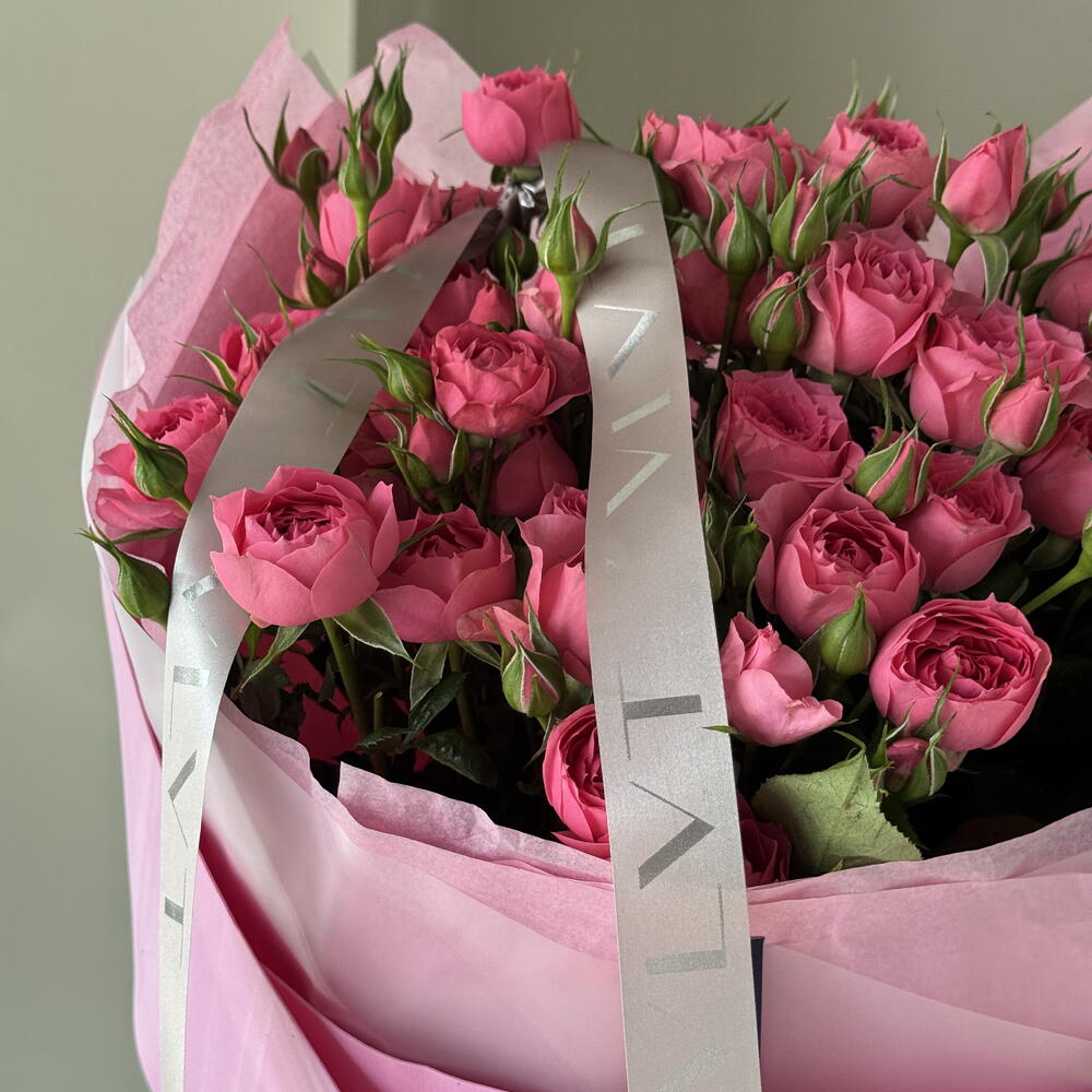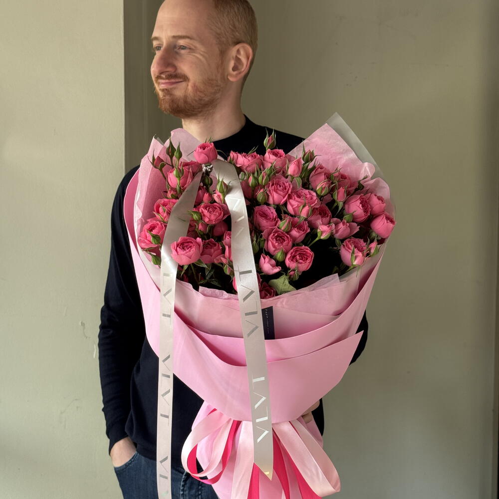 Яркий и выразительный букет из кустовых малиновых роз, наполненный глубиной цвета и характером. Насыщенный малиновый оттенок символизирует страсть, уверенность и искренние чувства, а множество бутонов на каждой ветке придаёт букету пышность и объём. Элегантное оформление подчёркивает сочность цвета, делая композицию эффектным подарком для тех, кого хочется удивить и по-настоящему порадовать.