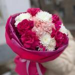 Хризантема кустовая - 4 шт. Гортензия розовая - 1 шт. Лагурус (сухоцвет) - 6 шт. розы малиновые 50 см - 5 шт.
