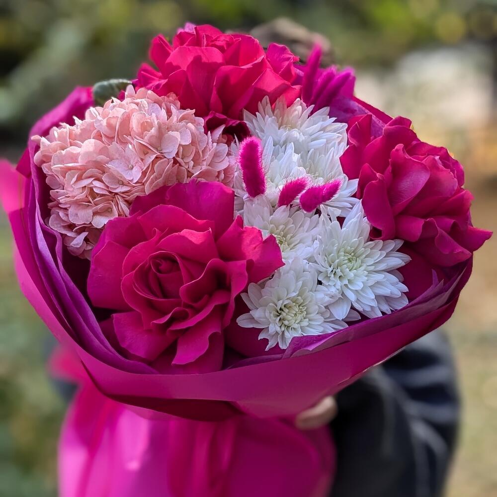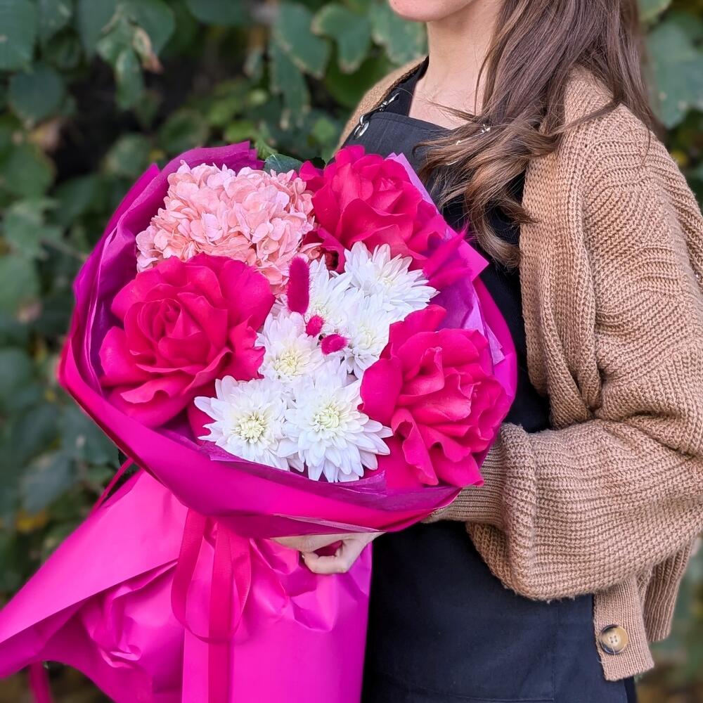 Яркий букет с гортензией и розами "Малиновый джаз" S
