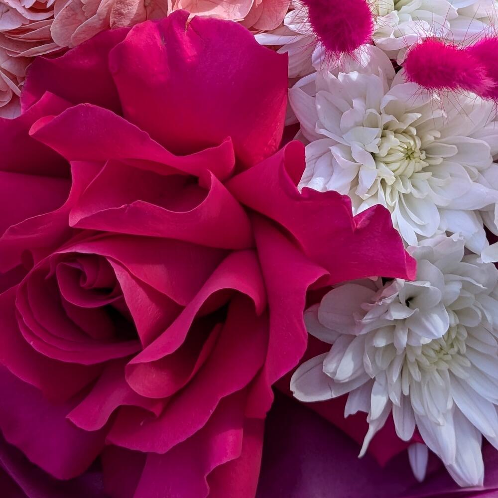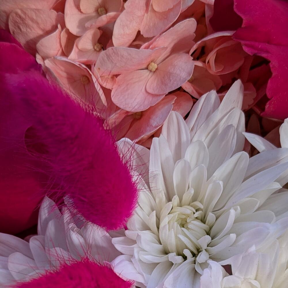 Гортензия - 1 шт. Хризантема кустовая - 2 шт. Роза - 3 шт. Лагурус - 6 шт.
