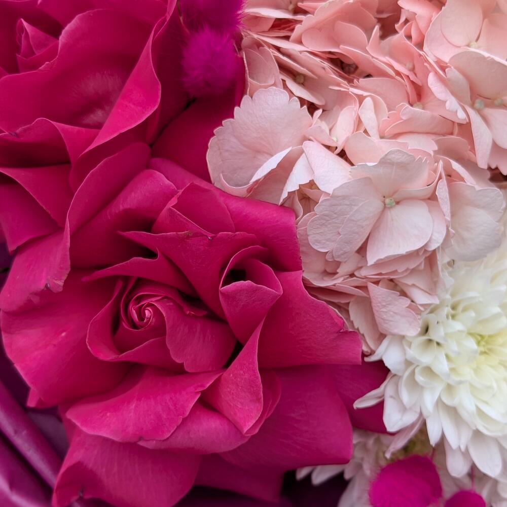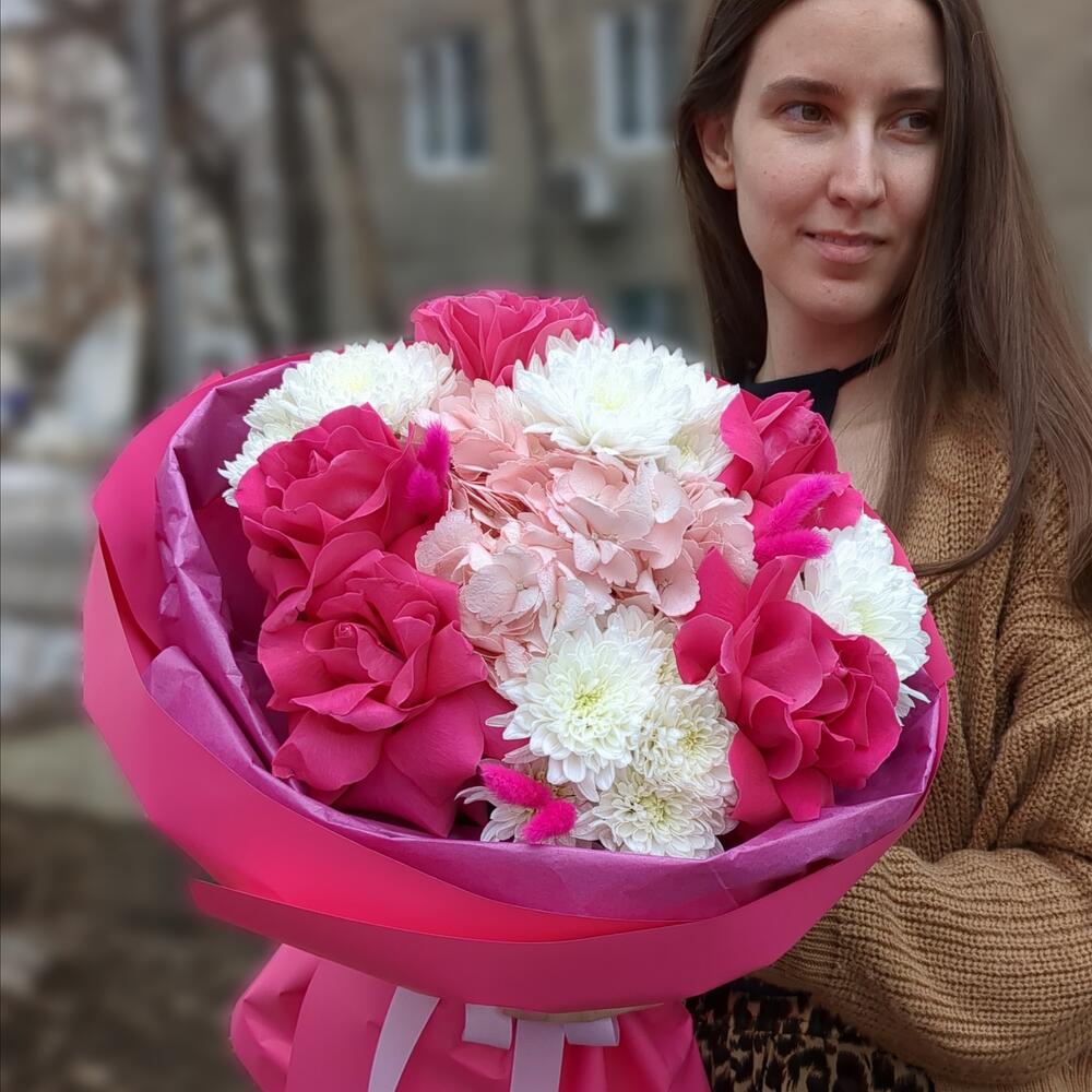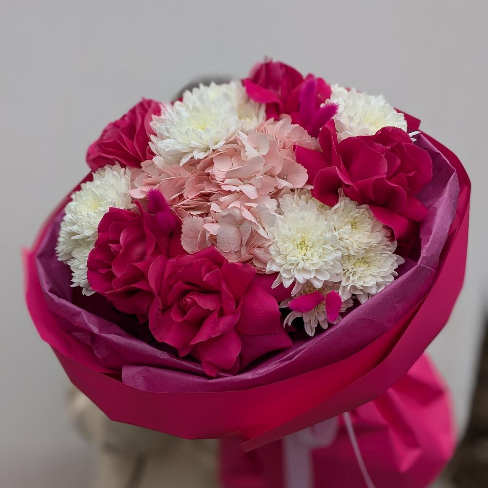 Хризантема кустовая - 4 шт. Гортензия розовая - 1 шт. Лагурус (сухоцвет) - 6 шт. розы малиновые 50 см - 5 шт.
