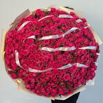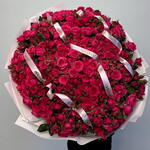 Роскошный моно-букет из кустовых роз насыщенного малинового оттенка. Сотни миниатюрных бутонов собраны в плотную, идеально округлую форму, создавая эффект сплошного цветочного ковра. Яркий цвет символизирует страсть, уверенность и сильные эмоции. Букет оформлен в лаконичную светлую упаковку, которая подчёркивает глубину оттенка роз, а фирменные ленты добавляют аккуратный, премиальный штрих. Он выглядит масштабно, эффектно и производит вау-впечатление с первого взгляда. Идеально подойдёт: — для признания в любви — на день рождения — юбилей — особенный, значимый момент, когда хочется сказать «ты невероятна» без слов