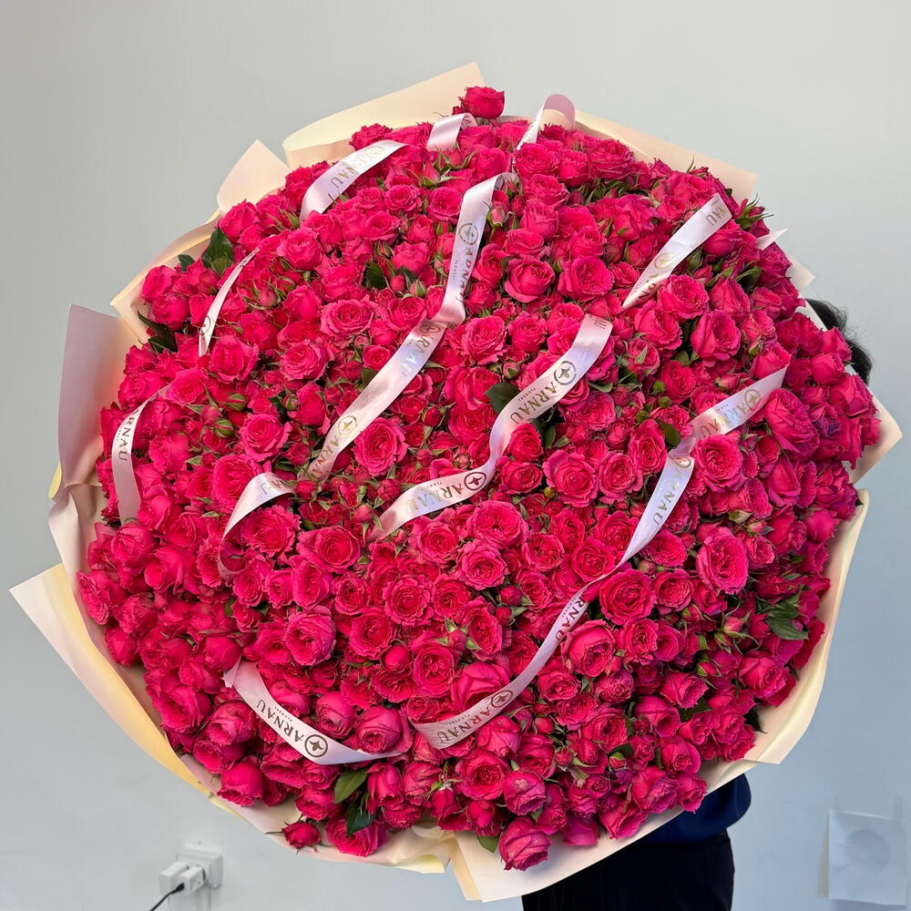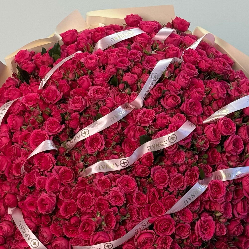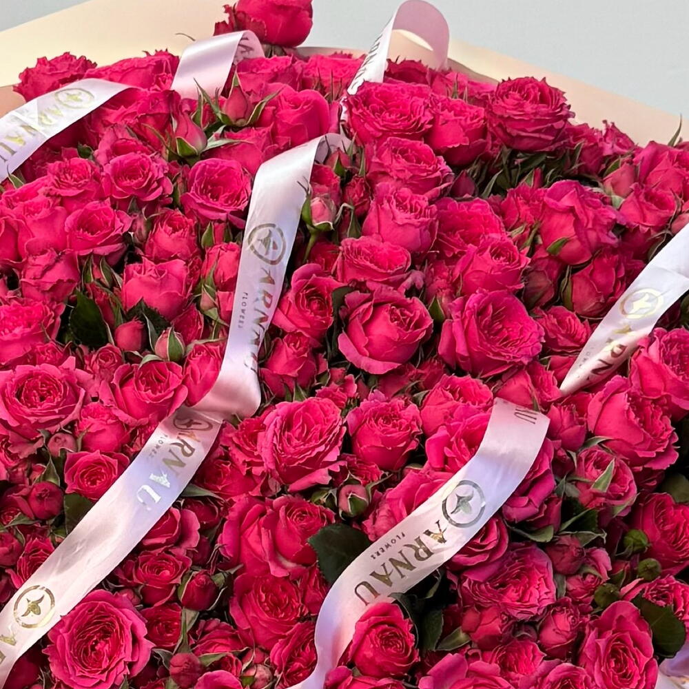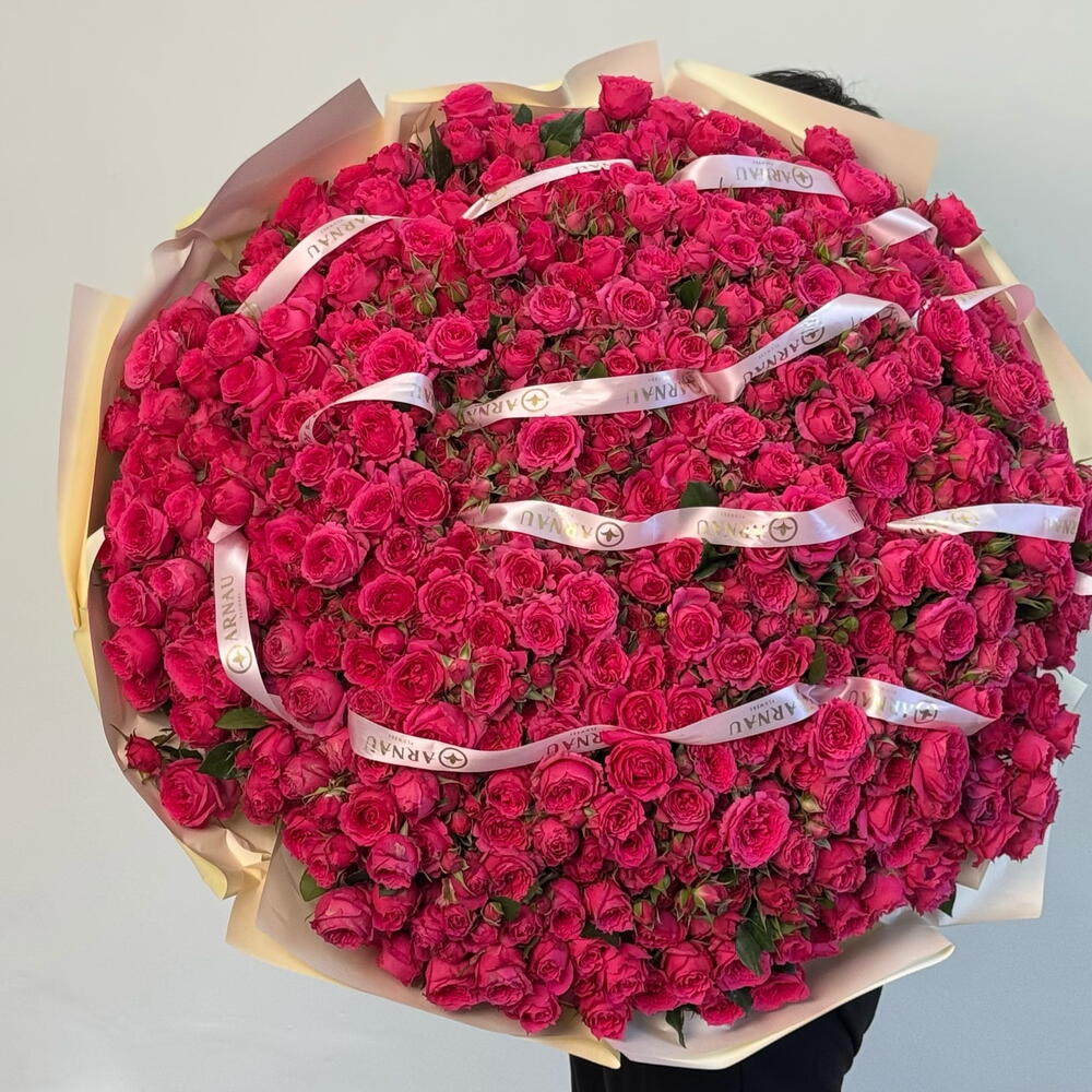 Роскошный моно-букет из кустовых роз насыщенного малинового оттенка. Сотни миниатюрных бутонов собраны в плотную, идеально округлую форму, создавая эффект сплошного цветочного ковра. Яркий цвет символизирует страсть, уверенность и сильные эмоции. Букет оформлен в лаконичную светлую упаковку, которая подчёркивает глубину оттенка роз, а фирменные ленты добавляют аккуратный, премиальный штрих. Он выглядит масштабно, эффектно и производит вау-впечатление с первого взгляда. Идеально подойдёт: — для признания в любви — на день рождения — юбилей — особенный, значимый момент, когда хочется сказать «ты невероятна» без слов