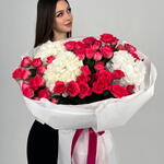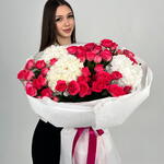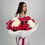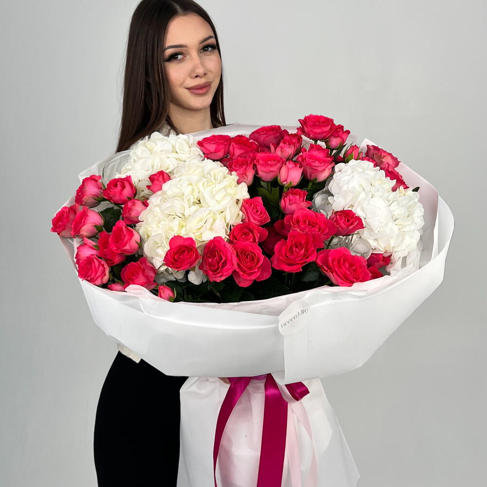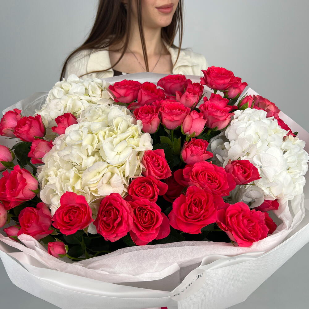 Яркий, чувственный букет с акцентом на розы и мягким облаком гортензий. Создан для подарков без повода, но с эмоциями.