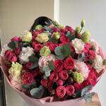 Яркий, сочный и живой букет с характером. Насыщенные малиновые кустовые розы переплетаются с нежной гвоздикой в кремовых и салатовых оттенках, а эвкалипт добавляет свежести и объема. Контраст цветов делает композицию динамичной и запоминающейся — идеальный выбор, когда хочется произвести впечатление и подарить эмоции.