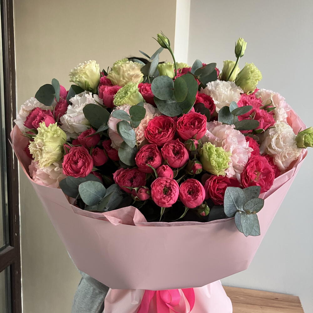 Яркий, сочный и живой букет с характером. Насыщенные малиновые кустовые розы переплетаются с нежной гвоздикой в кремовых и салатовых оттенках, а эвкалипт добавляет свежести и объема. Контраст цветов делает композицию динамичной и запоминающейся — идеальный выбор, когда хочется произвести впечатление и подарить эмоции.