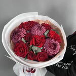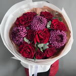 Хризантема одноголовая - 3 шт. Роза французская - 10 шт. Эвкалипт Цинерея - 2 шт.