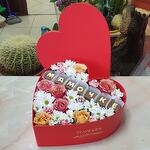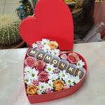 Хризантема кустовая - 2 шт. Роза Эквадор - 7 шт. Гвоздика кустовая - 5 шт. Оазис флористический - 1 шт. Шоколадные буквы конфеты - 7 шт. коробка сердце большое - 1 шт.