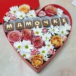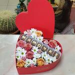 Большой аквабокс в виде сердца, с шоколадными буквами "мамочке" со сборными цветами в составе композиции, розы, хризантемы! кустовые гвоздики. идеальный подарок на день рождения 8 марта, юбилей