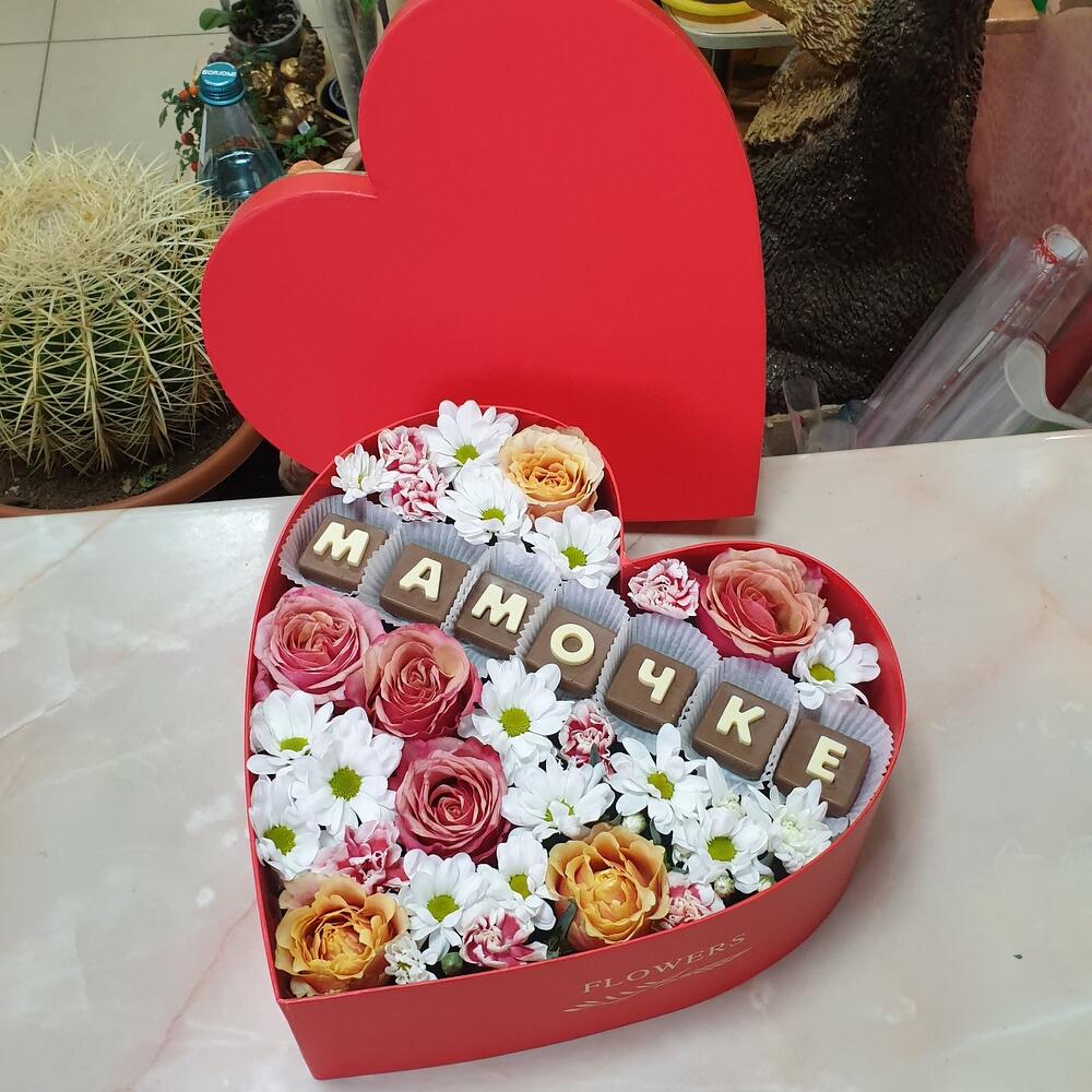 Большой аквабокс в виде сердца, с шоколадными буквами "мамочке" со сборными цветами в составе композиции, розы, хризантемы! кустовые гвоздики. идеальный подарок на день рождения 8 марта, юбилей