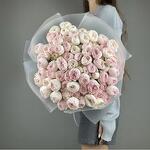 Это нежные кустовые розы с крупными, густомахровыми бутонами пастельно-розового оттенка с лёгким персиковым или бежевым отливом. У них волнистые лепестки, собранные в шаровидные цветки, которые распускаются пышными, многослойными шапками. На одной ветке обычно 3–5 бутонов, поэтому 25 веток дадут очень объёмный, воздушный и романтичный букет, подходящий для масштабных подарков — например, на свадьбу, юбилей или важное событие.