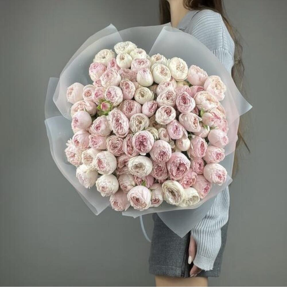 Это нежные кустовые розы с крупными, густомахровыми бутонами пастельно-розового оттенка с лёгким персиковым или бежевым отливом. У них волнистые лепестки, собранные в шаровидные цветки, которые распускаются пышными, многослойными шапками. На одной ветке обычно 3–5 бутонов, поэтому 25 веток дадут очень объёмный, воздушный и романтичный букет, подходящий для масштабных подарков — например, на свадьбу, юбилей или важное событие.