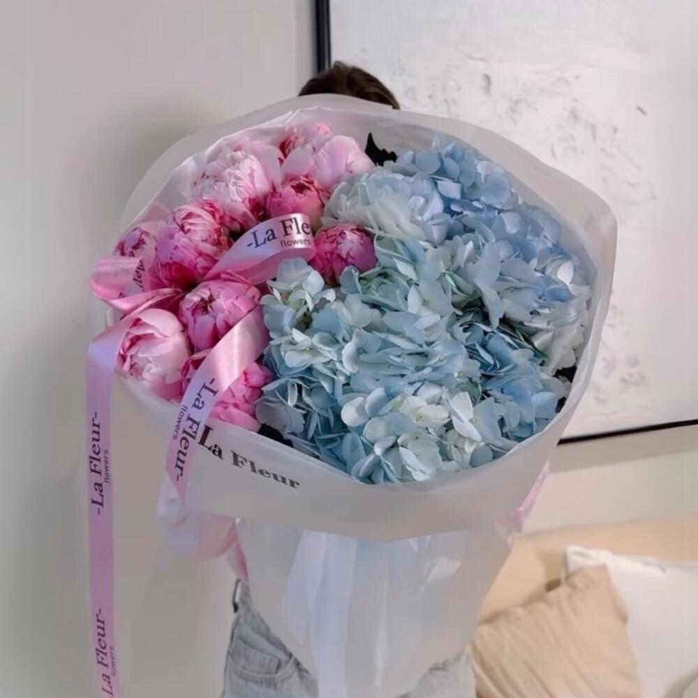 Небесно-голубая гортензия и пионовидные розы Сара Бернар — воздушный, как утро, букет для мечтательных и влюблённых.